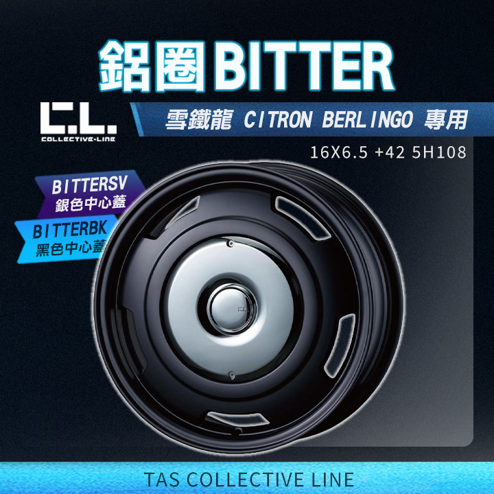 首頁 產品專區 【MRK】日本進口TAS Collective Line 鋁圈【Bitter】16x6.5 +42 5H108 霧面黑/銀 雪鐵龍 CITRON Berlingo