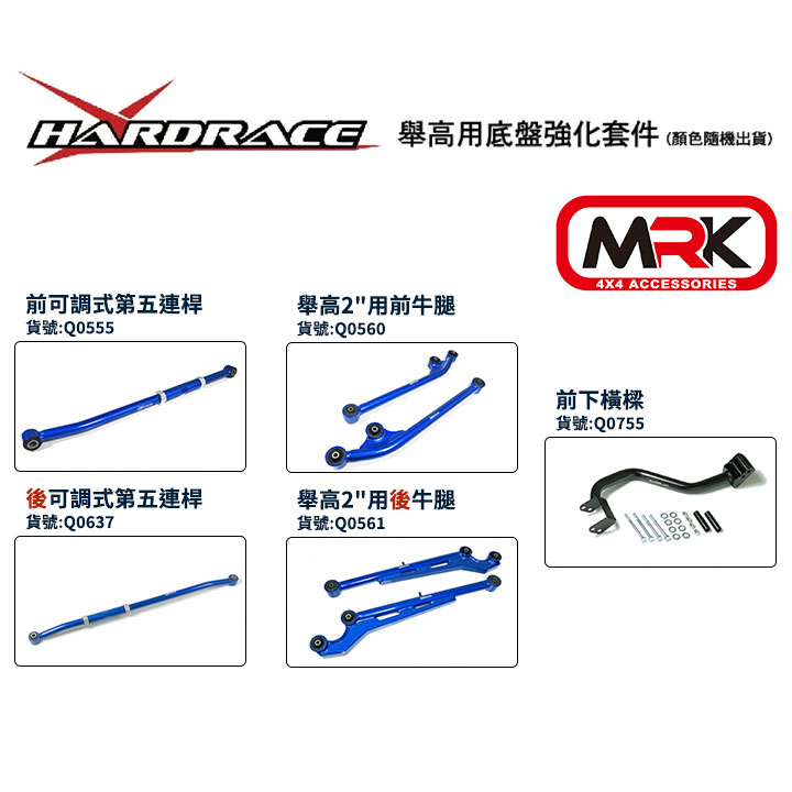 Q0555+Q0637+Q0560+Q0561+Q0755 前後第五連桿 前後牛腿 前下橫樑7件套組Q0555 前可調式第五連桿Q0637 後可調式第五連桿Q0560 舉高2"用前牛腿Q0561 舉高2"用後牛腿Q0578 前防傾桿Q0755 前下橫樑Q0784 剎車總泵固定器
