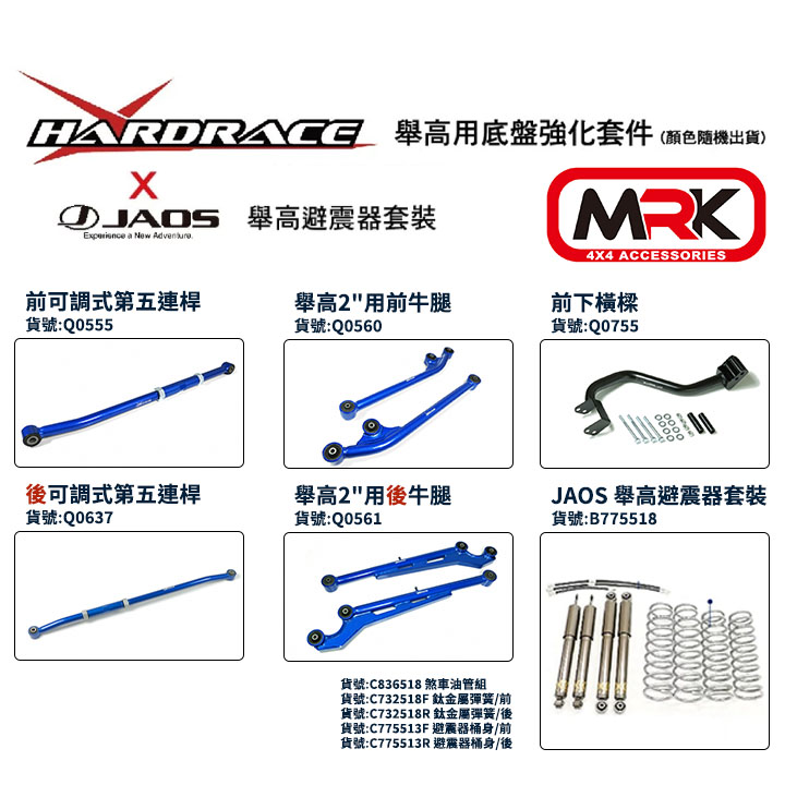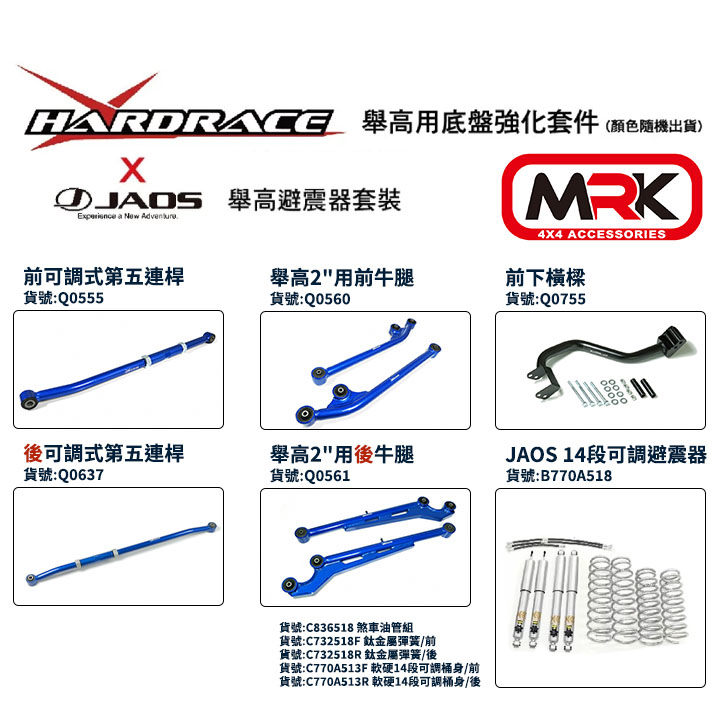 【HARDRACE】JIMNY舉高用底盤強化套件 前後第五連桿 前後牛腿 前下橫樑 7件套組 + JAOS 避震器 JIMNY∥MRK