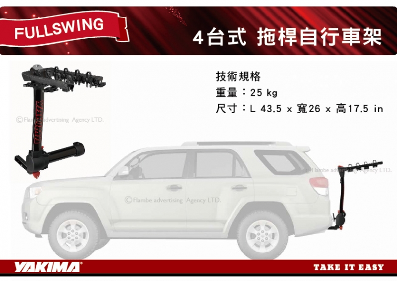 首頁 產品專區 【YAKIMA】FULLSWING 全速搖擺(4車) 拖車式腳踏車架 自行車攜車架 2465