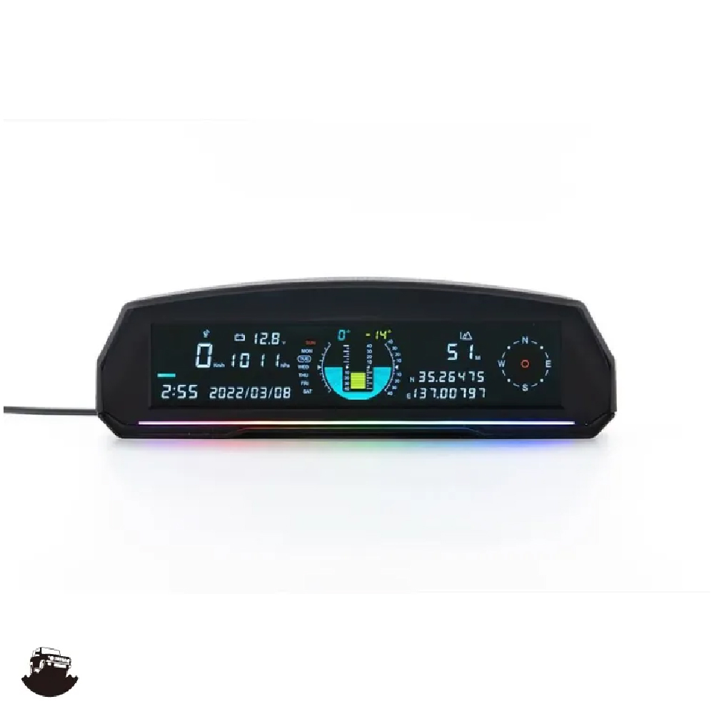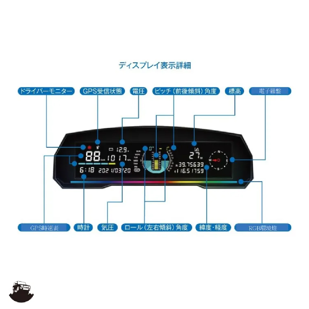 ●標高 ●(前後傾斜)角度 ●(左右傾斜)角度 ● 緯度、經度 ●氣壓 ●速度計 ●速度報警 ●電壓 ●電子羅盤 ●手錶 ●新功能 駕駛員顯示器 ●Ambient Light ●自動 Dimer